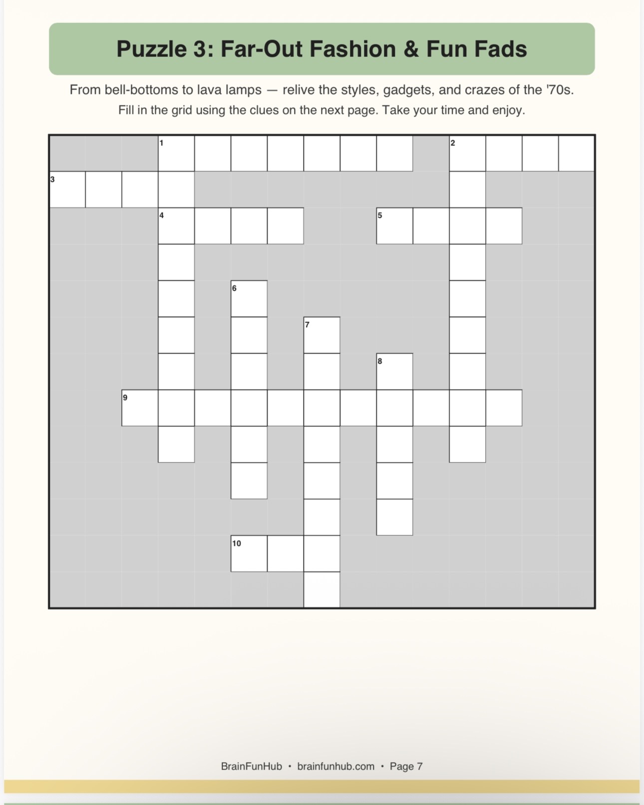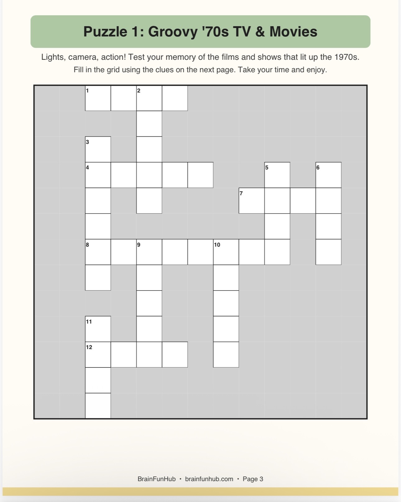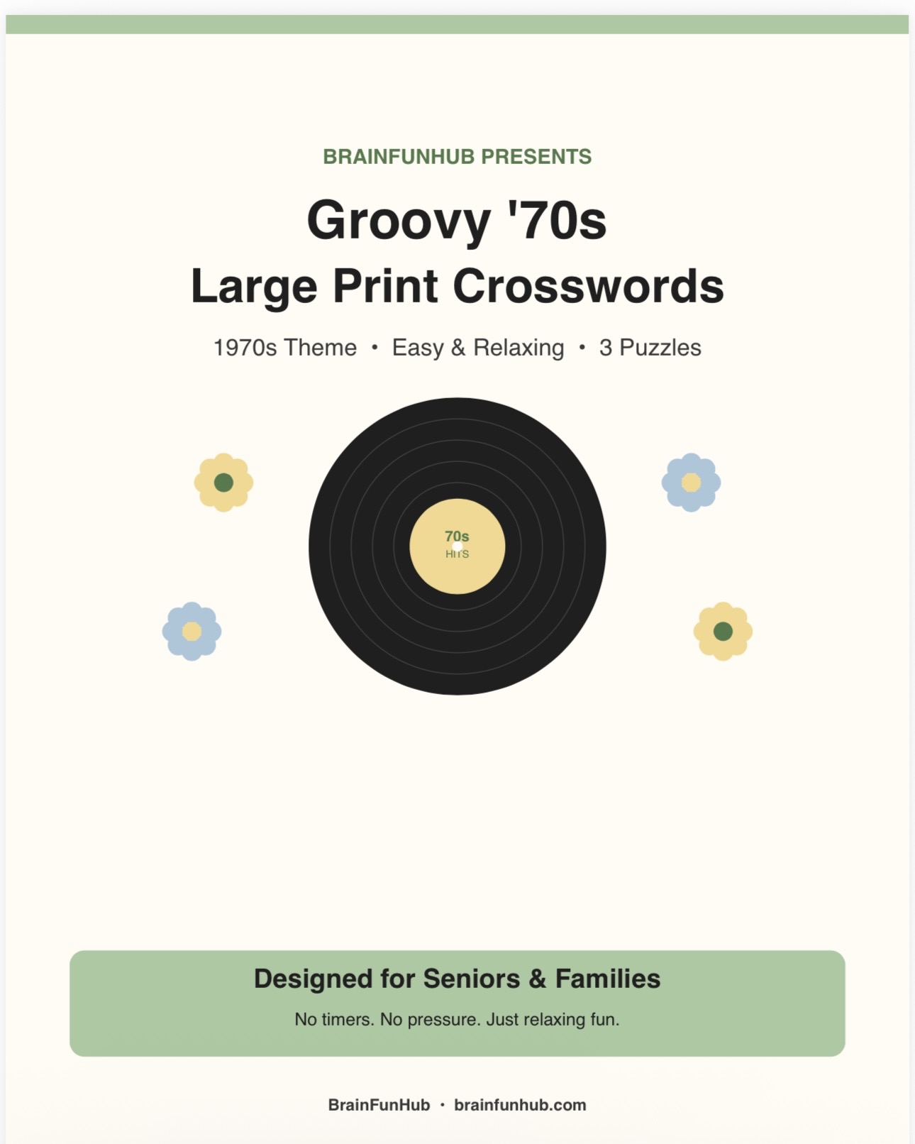 This printable crossword pack brings the 1970s back to life through three large print puzzles packed with nostalgic clues. It's designed for seniors and families who want a relaxing activity they can enjoy at their own pace, no timers and no pressure.