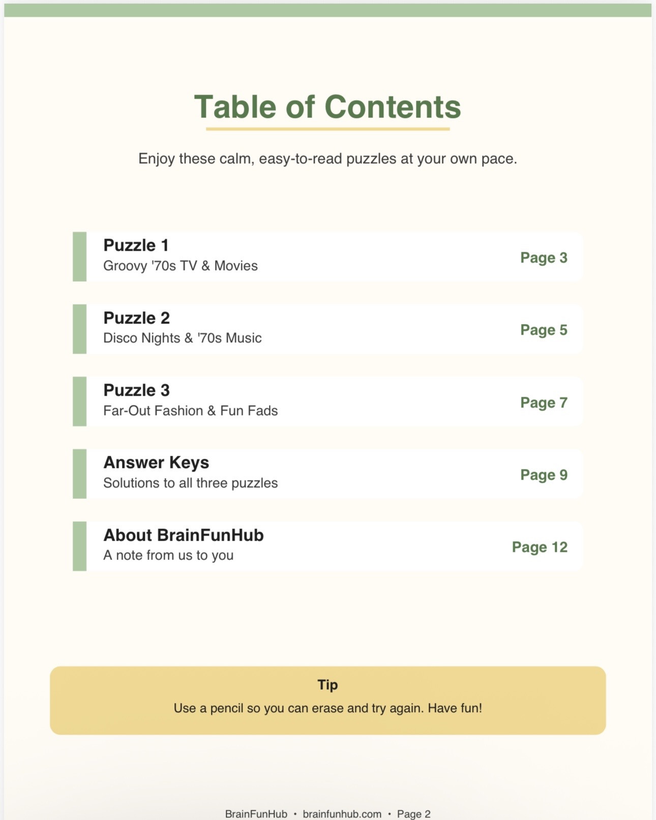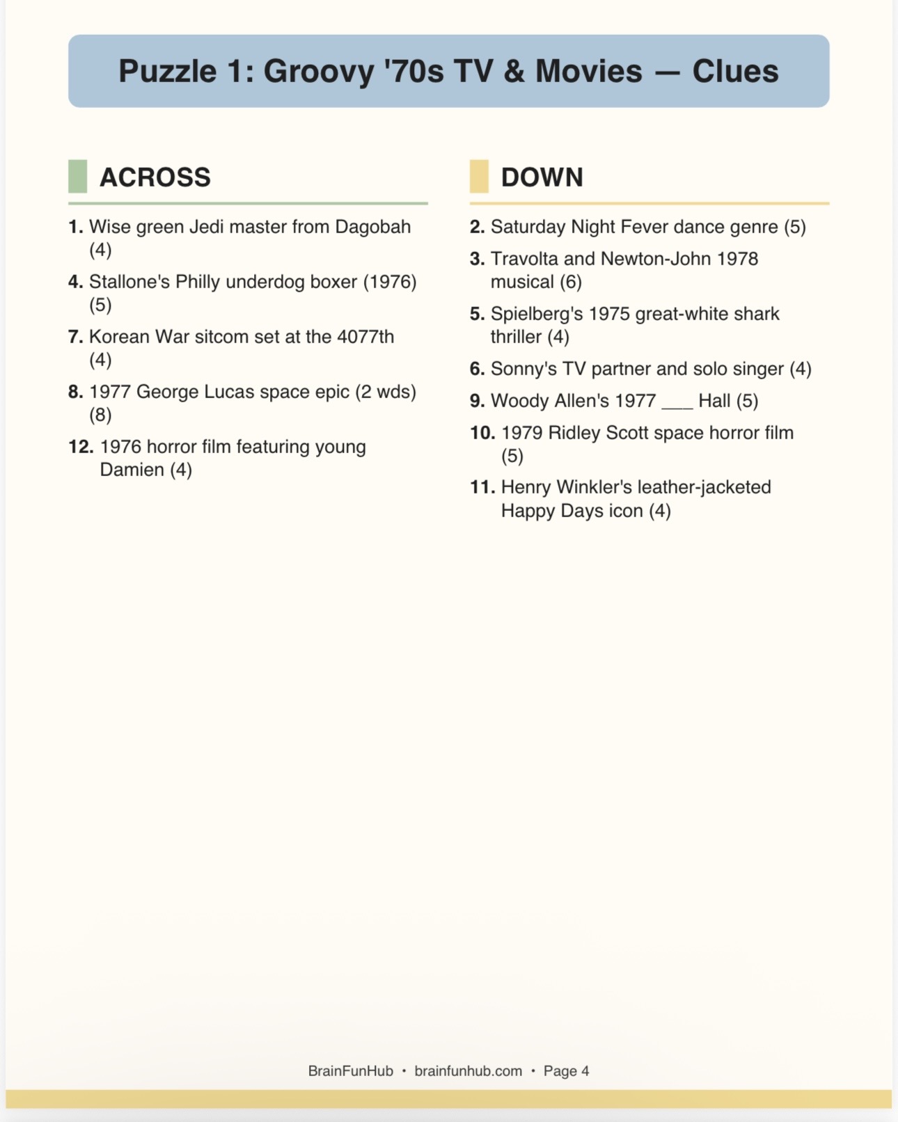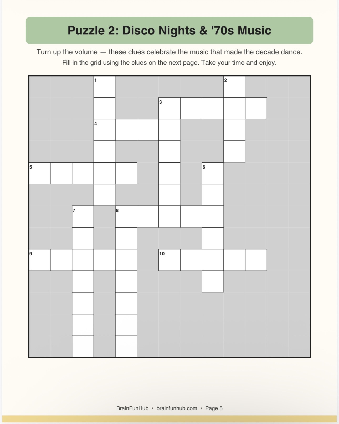 This printable crossword pack brings the 1970s back to life through three large print puzzles packed with nostalgic clues. It's designed for seniors and families who want a relaxing activity they can enjoy at their own pace, no timers and no pressure.